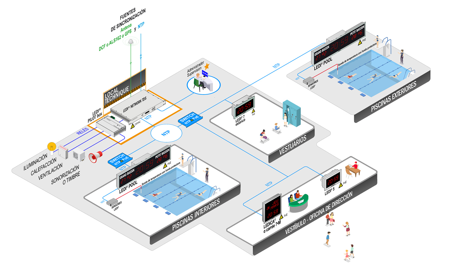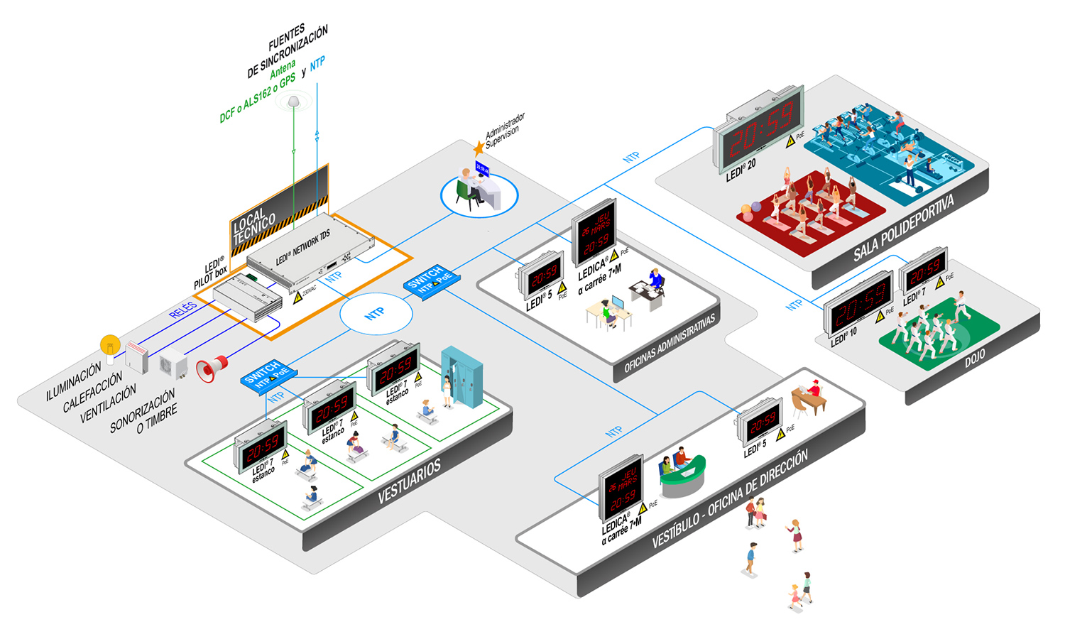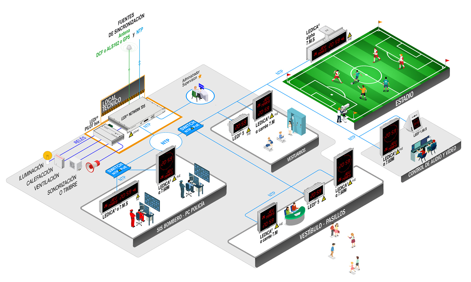 En infraestructuras deportivas, los sistemas de visualización horaria y sincronización NTP para audiovisuales, difusión y control de accesos son fundamentales para: